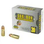 COR(R)BON JHP(TM) is the traditional hollow point that put COR(R)BON on the map. JHP(TM) is proven ammunition that provides reliable penetration and expansion. The internal and external serrations and soft lead cavity provide stopping power and an average penetration of 9 to 15 inches in ballistic gelatin.