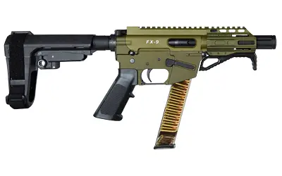 Freedom Ordnance FX9, Semi-automatic, Pistol, 9MM, 4 Barrel, Faux Suppressor, Anodized Finish, Olive Drab Green, SBA3 Pistol Brace, Freedom Ordnance Angled Fore Grip, 32 Rounds, 1 Magazine FX9P4S-ODG