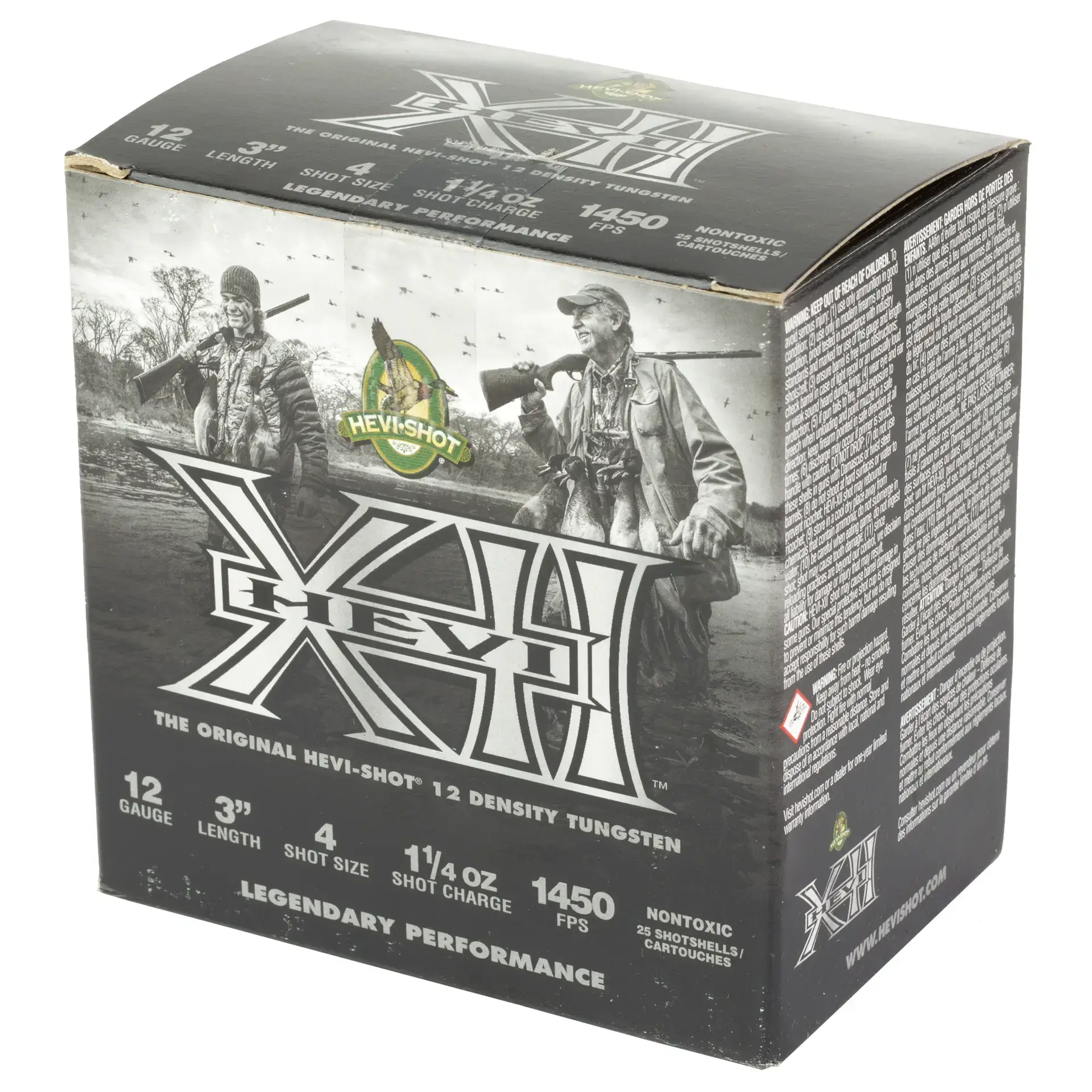 THE ORIGINAL HEVI-SHOT” now in a 25-round box. Introducing Hevi-XII. Shoot three shot sizes smaller than steel for the same lethality with 28% more tungsten pellets on target. Pack Hevi-XII in and walk out carrying extra weight.