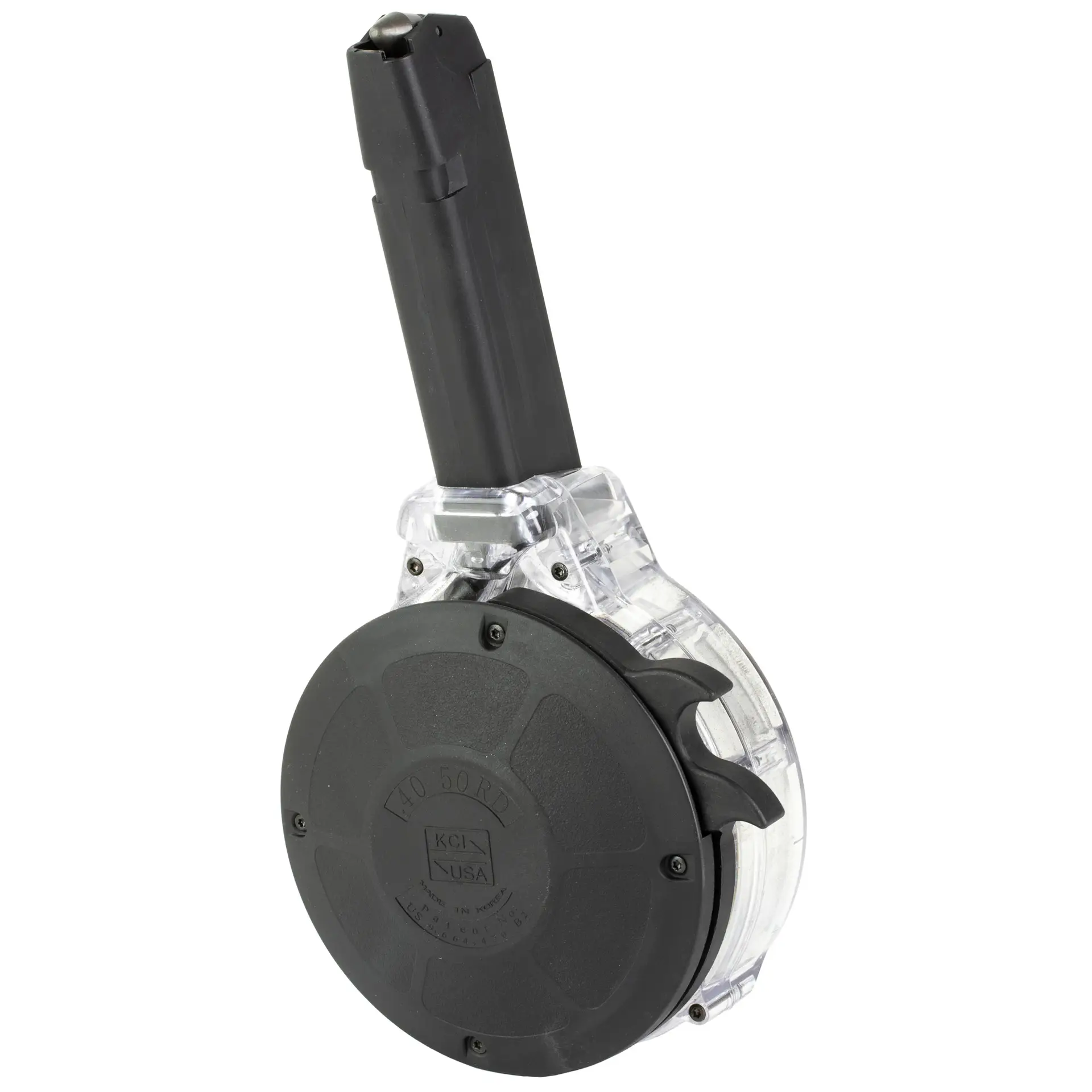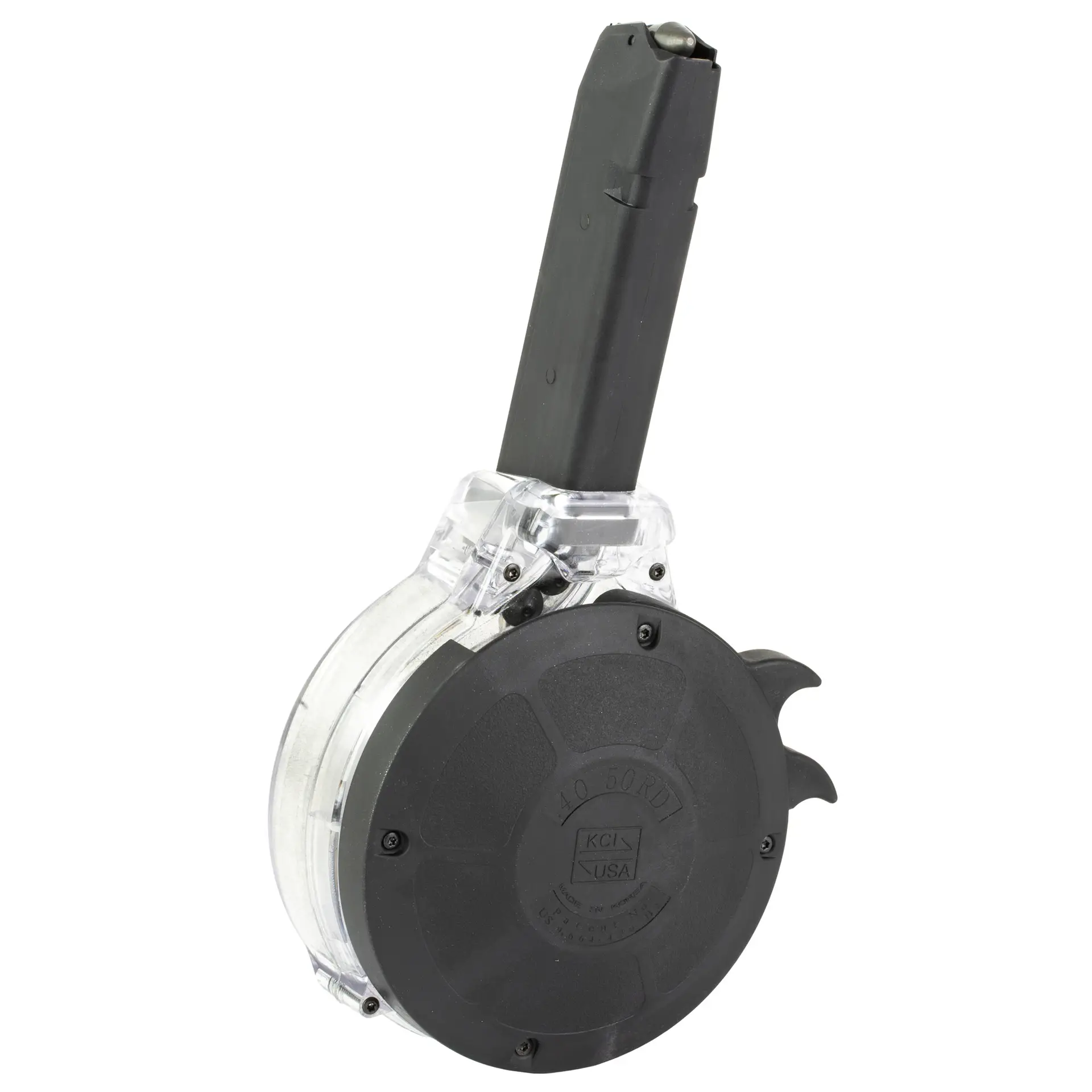 KCI’s 50 round 40 Smith & Wesson Glock pattern drum is a clear glass-filled polymer body and features steel internal components. The load assist lever makes for fast and effortless loading. Disclaimer: Lifetime Warranty VOIDED if customer disassembles magazine! This magazine is not designed to be used with hollow point ammo. For use in Glock patterned pistols.