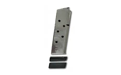 Designed for Compact and Ultra Kimber models” this Tac-Mag features a Teflon-coated stainless steel follower” Rocket wire spring and an exclusive quick-change floorplate with three included bases: a conventional stainless steel plate” slim bumper pad and a thick bumper pad for competition or use with extended magazine wells.