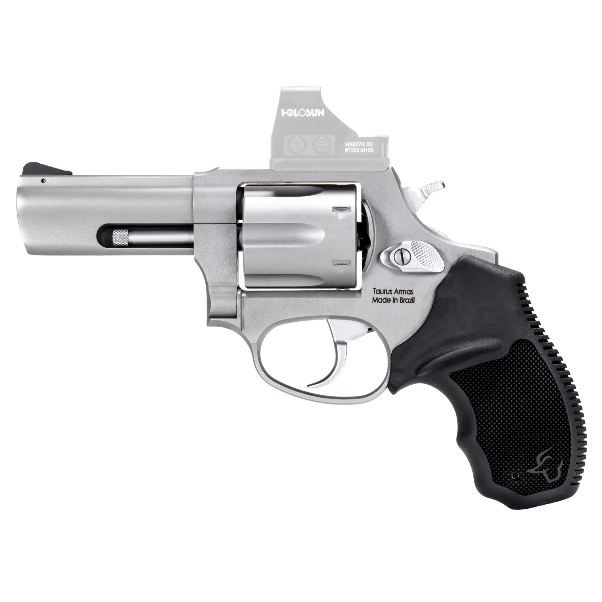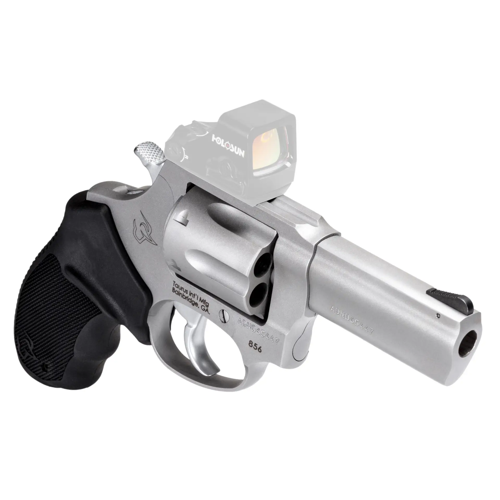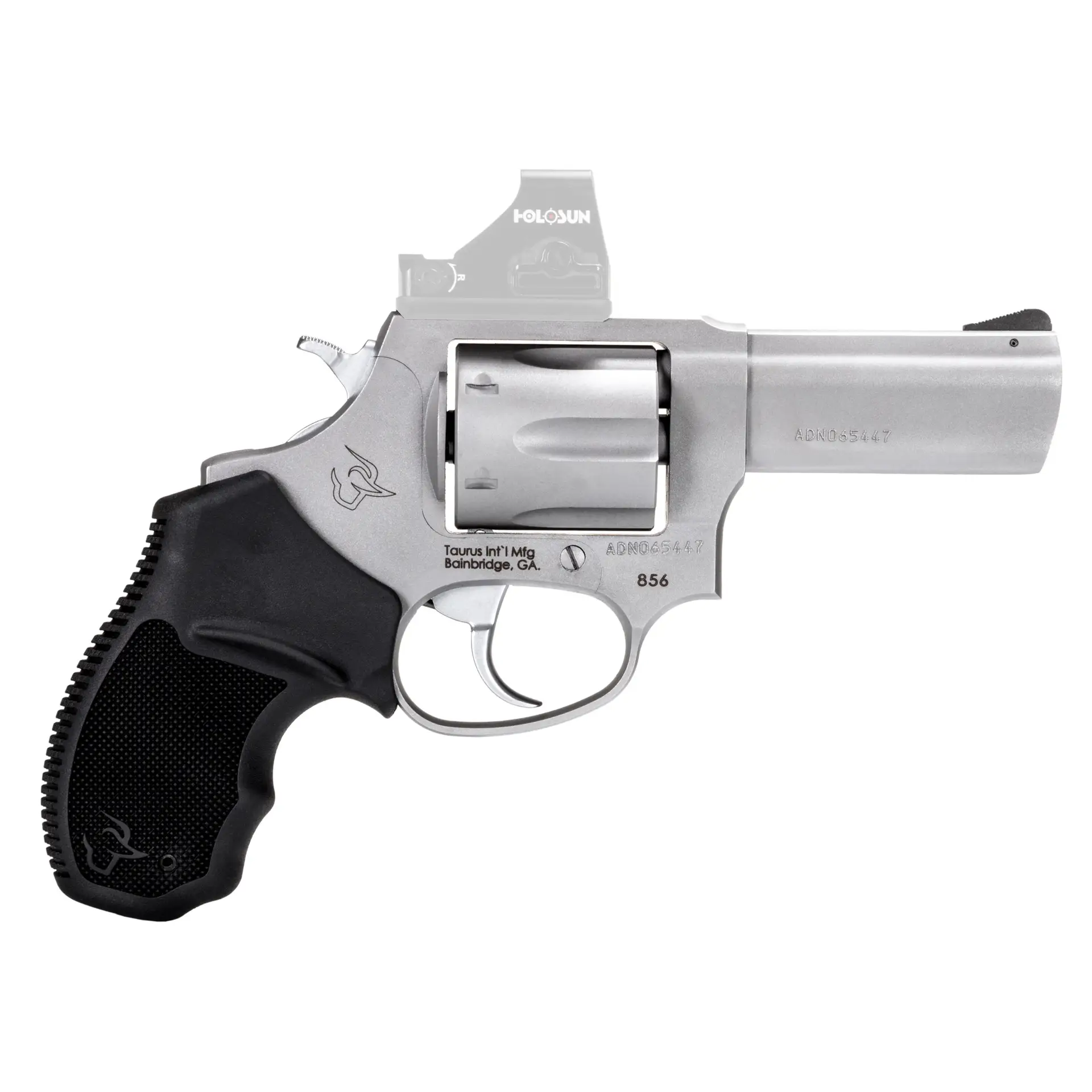 The Taurus 856 is a reliable 6-shot, 38 Special revolver that features soft rubber grips-making it comfortable to shoot at the range while the double/single action increases speed and accuracy for follow-up shots. The 856 is offered in either a Matte Black or Matte Stainless finish. Known for its easily managed recoil impulse, the .38 Special round of the 856 can accommodate ammunition ranging from light target loads to self-defense rounds. The 2-inch barrel on the 856 now comes with a removable serrated front sight optimizing on-body or off-body carry, and home defense usage.