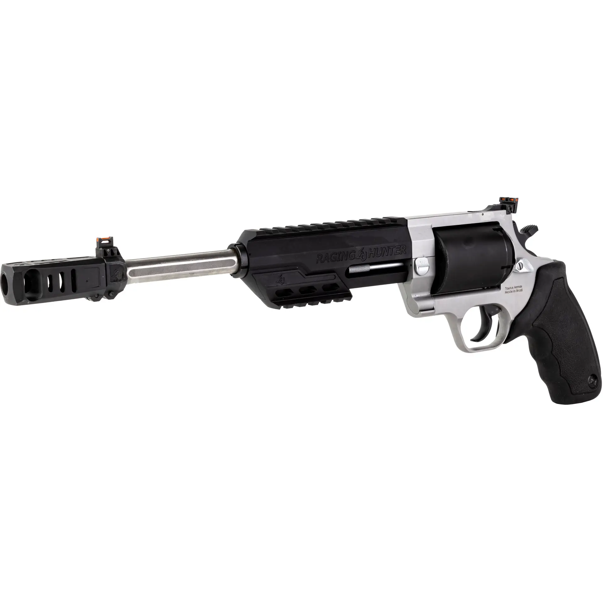 Winner of the 2019 American Hunter Handgun of the Year Golden Bullseye Award, the Taurus Raging Hunter is a next-generation, big-bore revolver that’s first in innovation-and built to last. A fun and effective alternative for short- to medium-range hunting scenarios, this five-shot revolver is chambered in 460 S&W Magnum and is available in Matte Black or Two Tone finish. Its revolutionary angular barrel design cuts down on overall weight, while its factory tuned porting and gas expansion chamber reduces muzzle lift for quicker target acquisition. Cushioned insert grips ensure a comfortable, controllable shooting experience.